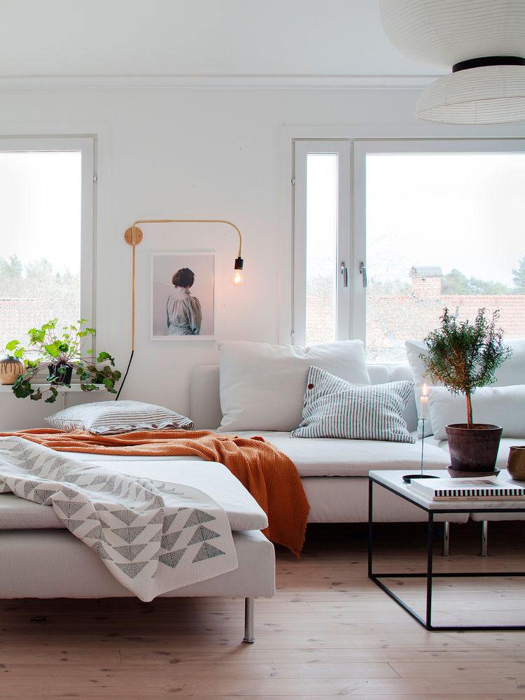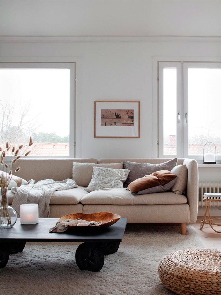 El sofá es de la serie Söederhamn de Ikea y como veis sólo con un cambio de patas, ha pasado del frío acero a la cálida madera.