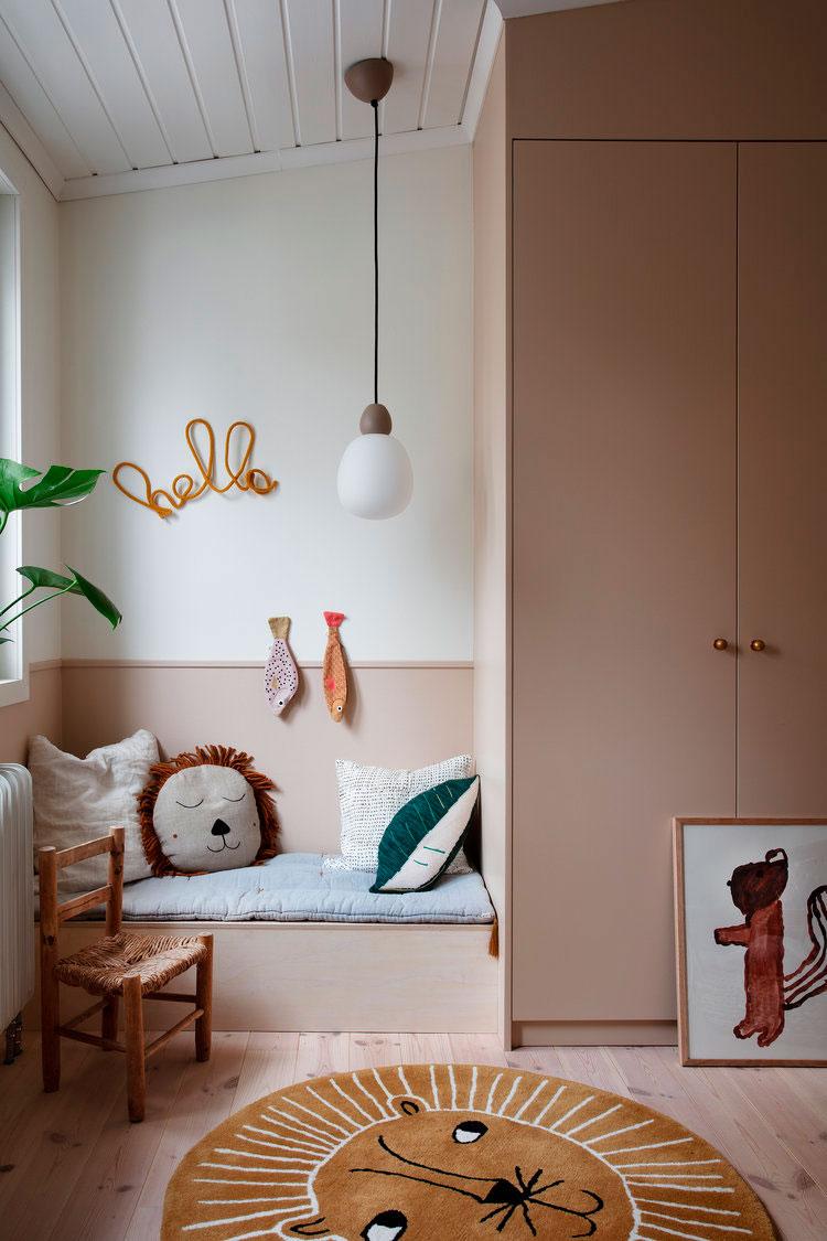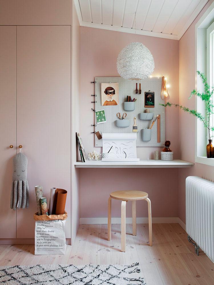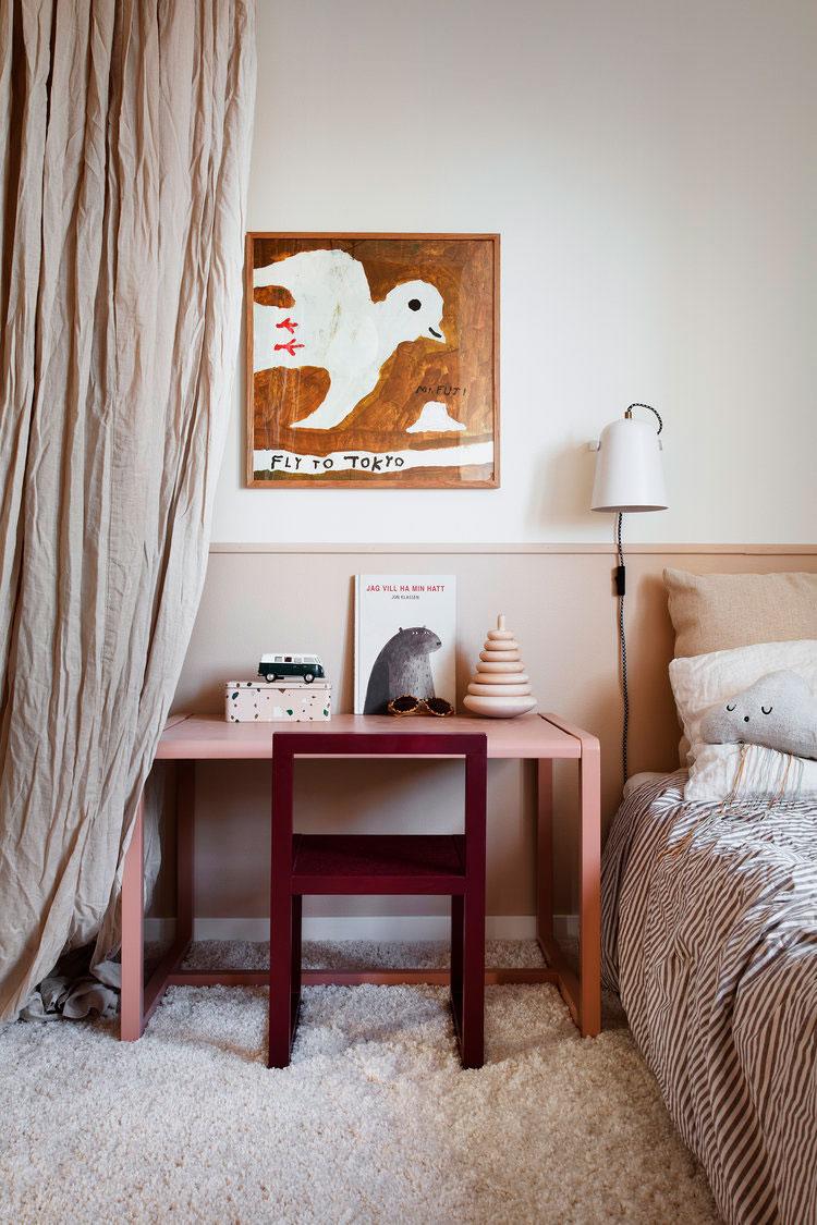 La habitación infantil estaba pintada en origen en un azul grisáceo, precioso color en mi opinión, pero el dormitorio tiene orientación norte por lo que este tono la oscurecía más. Mirad qué luz se ha conseguido tan sólo pintando algunos elementos en rosa palo. Además de eso, se aprovechó el hueco que quedaba entre el armario y la pared, para construir un pequeño sofá como rincón de lectura. Y a media altura de la pared se añadió un pequeño listón, que separa la parte superior de la inferior permitiendo así pintar la zona a dos colores (el mismo rosa en la parte inferior y en blanco, para ganar luminosidad, en la superior).