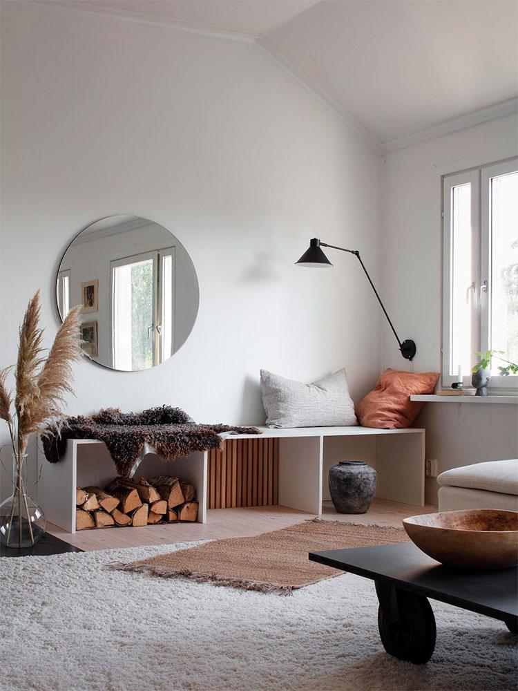 Este rincón junto a la chimenea también ha sufrido un cambio. Se sustituyeron los armarios por un banco realizado a medida, con espacio de almacenaje en su parte inferior para albergar objetos como la leña.