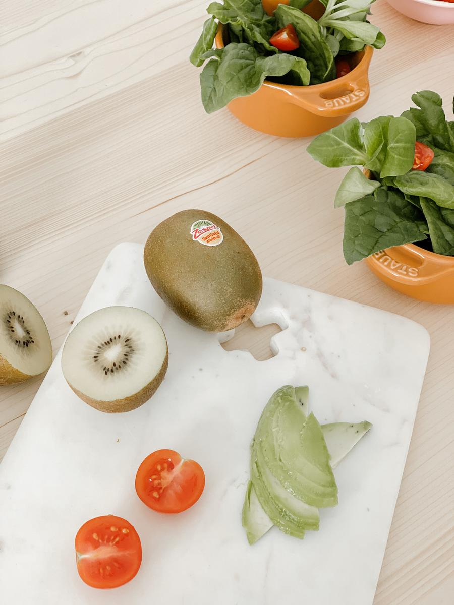 Seguidamente cortamos a láminas el aguacate (con ayuda de una cuchara conseguiréis que os queden finos y perfectos) y también a cuartos los tomates y los Zespri Sungold que le darán el toque de dulzor a la ensalada.