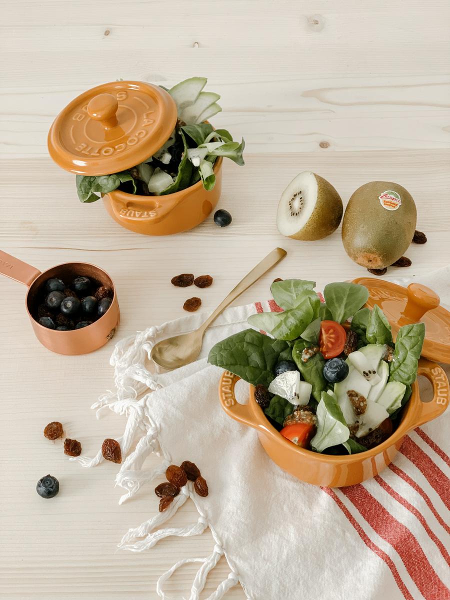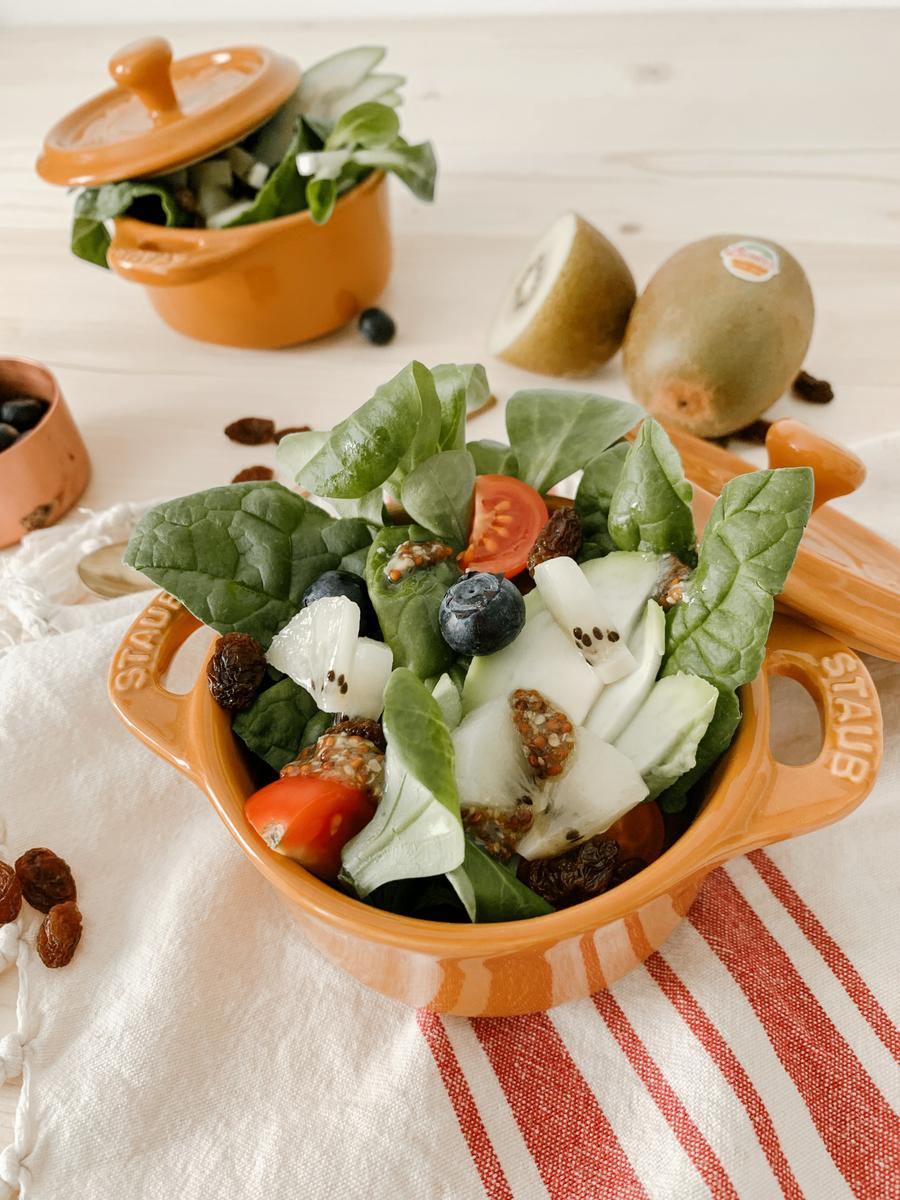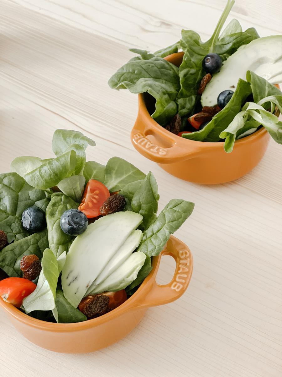 Primero de todo ponemos la base de la ensalada (las espinacas frescas y los canónigos) en el recipiente que vayamos a usar. Yo utilicé estas mini ollitas pero también podéis usar cualquier bol pequeño o incluso tazas para darle un toque más original.