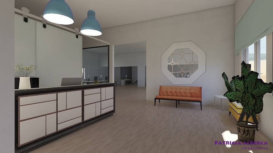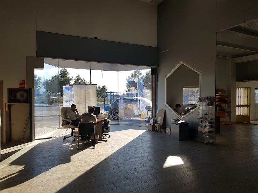 Zona recepción con mostrador personalizado y acceso general a la zona de oficinas y sala de juntas/exposición de producto.