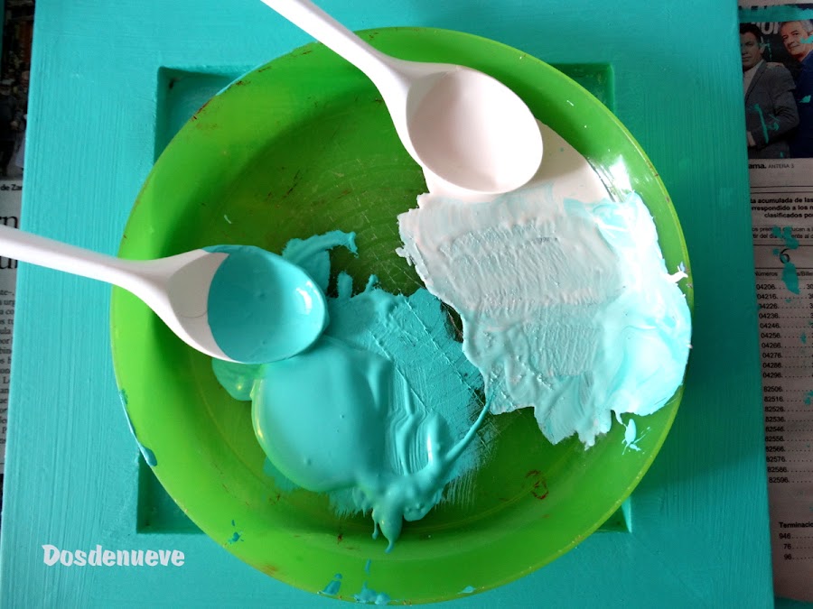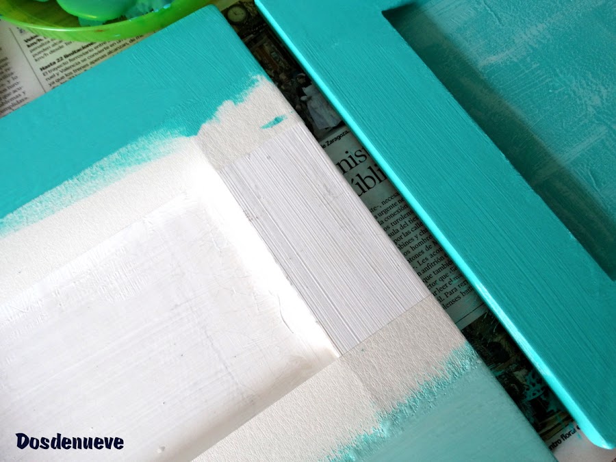 Sobre el blanco hemos pintado los marcos de color verde en degradé y, para ello, nos hemos inspirado en un trabajo del blog anfitrión que nos encantó. Se trataba de un mueble de televisión que pintaron en azul degradé. Si queréis ver como lo hicieron os invitamos a que pinchéis aquí. En su post explican perfectamente todo el paso a paso para conseguir un perfecto degradé.