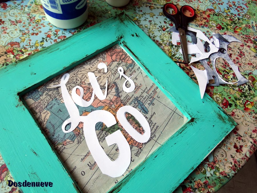 Sobre el mapa mundi añadimos la frase Let´s go, que hemos imprimido y recortado previamente, la pegamos y barnizamos todo para proteger bien el papel.