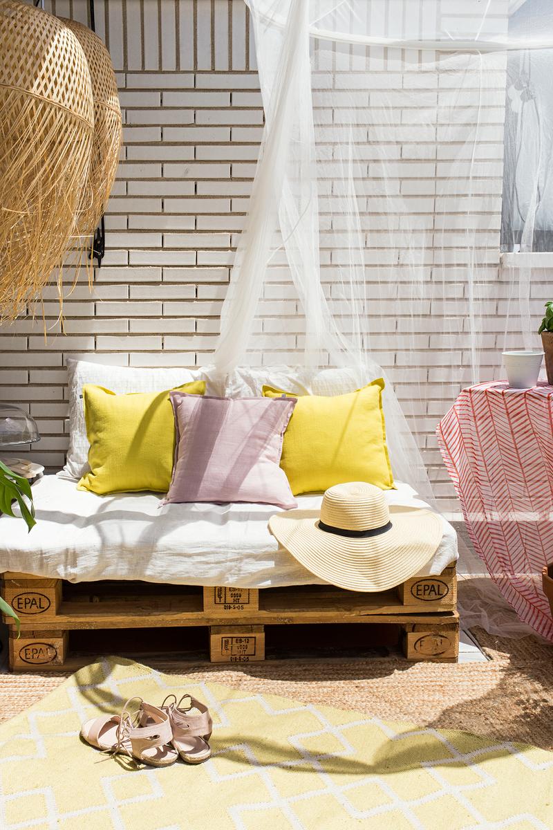 También tenemos un par de proyectos de decoración que hicimos para espacios exteriores y que podéis consultar en nuestro portfolio. El primero, lo hicimos en casa de María Pazos. Su terraza estaba vacía y en una sola mañana conseguimos montar este pequeño oasis (importante, pensar muy bien en el suelo, que en las terrazas suele ser sucio y «duro»; no subestiméis el valor de las alfombras de exterior para caminar descalzas, sentaros o tumbaros al sol). El otro fue en el exterior de una finca. Una pequeña zona de descanso y tertulia en un jardín árido y soleado.
