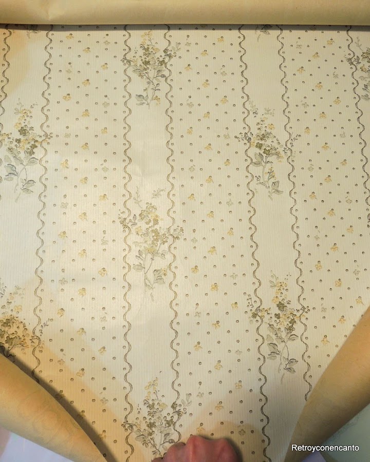 El color elegido nos llevó a este papel de empapelar, original de los 60, que una de nosotras recuperó de casa de su madre y que llevábamos tiempo queriendo usar.