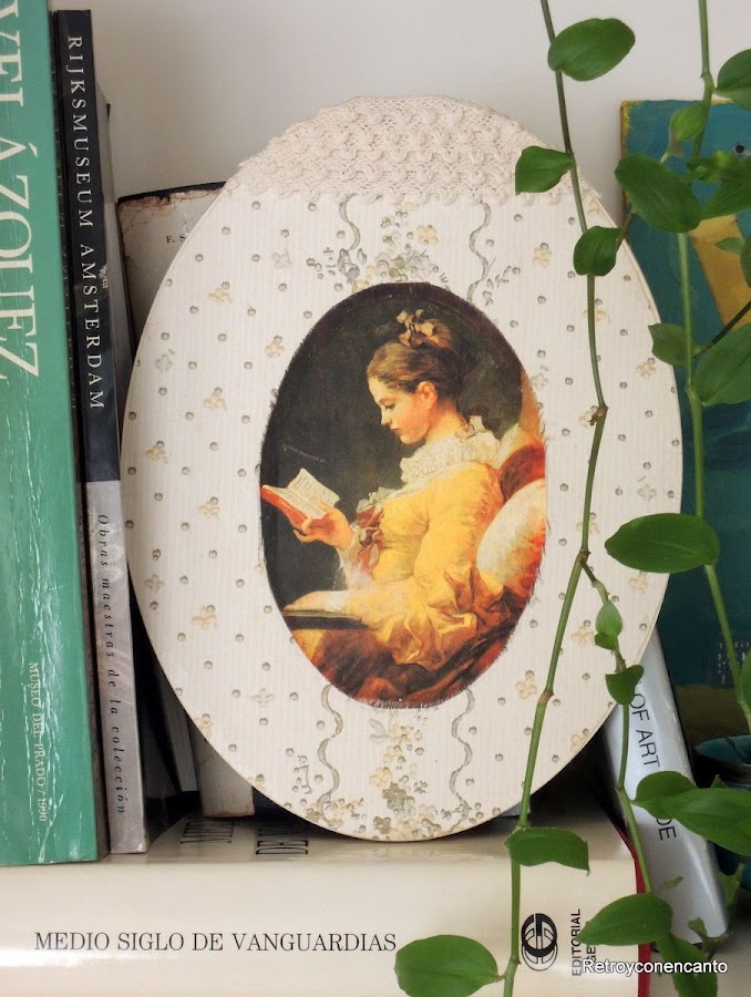 Podemos colgar o apoyar el cuadrito. Nosotras hemos elegido la segunda opción, dejándolo bien protegido por otros libros con los que continuar la lectura...