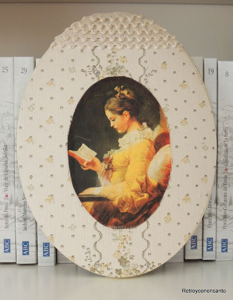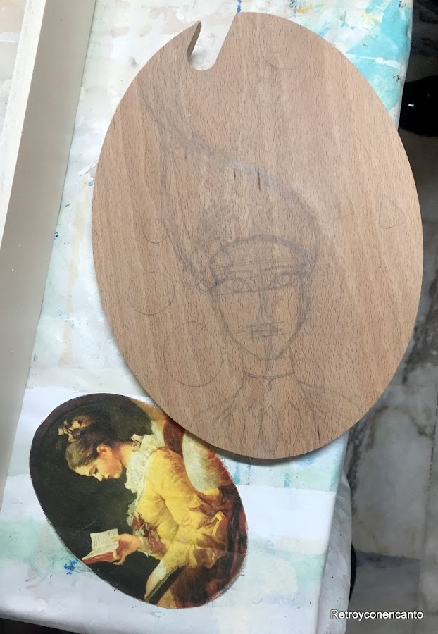 Y aquí ,otro de esos trozos de madera con un boceto que nunca llegó a terminar, y que guardábamos en el taller junto con esta pequeña imagen en tela, de una linda damisela muy ensimismada en su lectura.