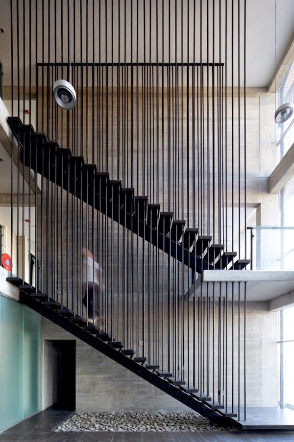 Metálicas Escalera volada con huella y contrahuella y barandilla a una altura razonable, es cómoda y preciosa, contrasta la escalera negra con el muro de hormigón blanco.