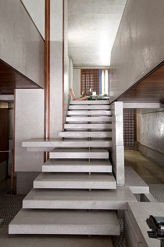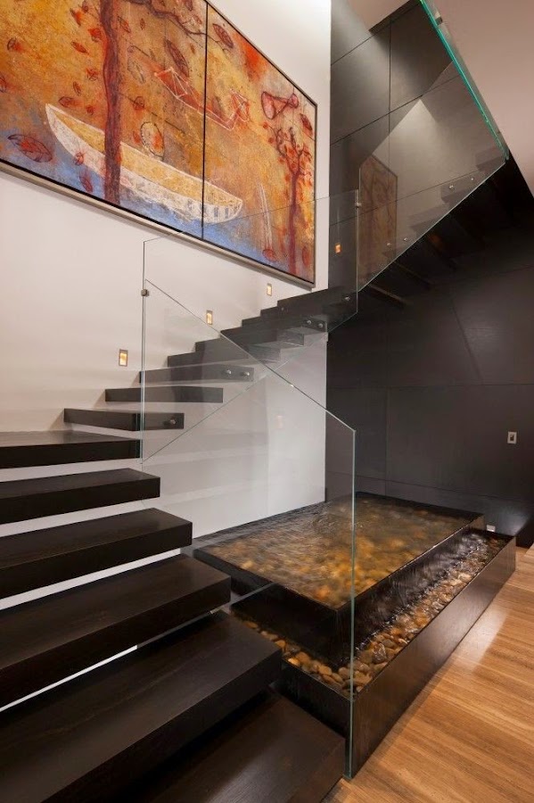 Una de mis favoritas, escalera volada revestida de madera con barandilla de vidrio. En contraste con el muro de hormigón y aprovechando el ojo de la escalera para colocar una fuente de agua relajante, sencilla y bella.
