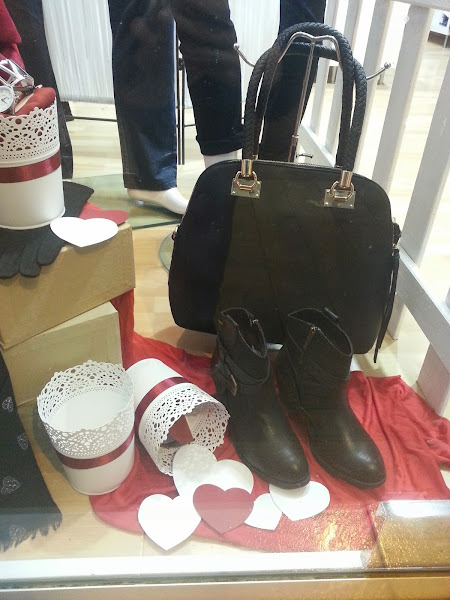 En este escaparate, quería hacer un bodegón en colores rojo y blanco y con diferentes elementos de la tienda, ropa, complementos y zapatos.
