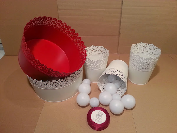 Lo primero que hice, fue elegir los cuencos con los que quería crear el bodegón. Los cuencos blancos los decore con cinta roja y en el caso del cuenco grande blanco le hice un lazo.