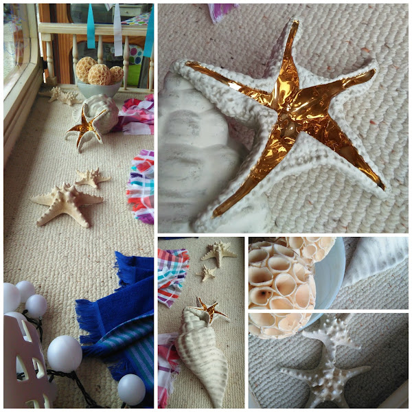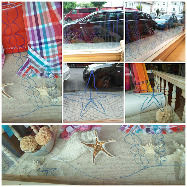 Sí sí, lo sé, ¿un fondo del mar minimalista?, ¿cómo se consigue eso? Pues... mi intento ha sido pintar el cristal del escaparate como si fuera el "agua", y utilizar detalles - algunos marinos y otros una libre interpretación de los tesoros que se encuentran en el fondo del mar - en tonos neutros para que, lo que más destaque sea el colorido de las toallas que - aquí va el DIY - hemos colgado de un improvisado toallero hecho con dos rollos de cortina y cuerdas a las que hemos atado con nudos de inspiración marinera.