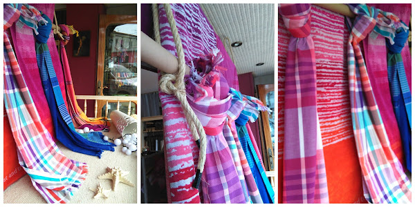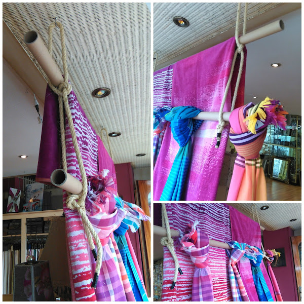 A falta de bañistas, pescadores y navegantes, nuestro mar tiene clientes que quieren la toalla del escaparate, o el paragüero, o la concha, o alguna de las estrellas (de hecho la dorada ya no está... duró un día en el escaparate, y ahora es la estrella de la casa de una de nuestras clientas :), por eso, nuestro escaparate es puro pragmatismo. La idea es que podamos entrar en él a descolgar toallas rápidamente, que, por el camino, no tropecemos con muchas cosas y que, después de hacerlo, el escaparate siga estando bonito, para lo que seguiremos colgando y anudando toallas con nudos marineros, todas las veces que haga falta durante los meses de verano.Os aseguro que cómodo sí que es, pero...