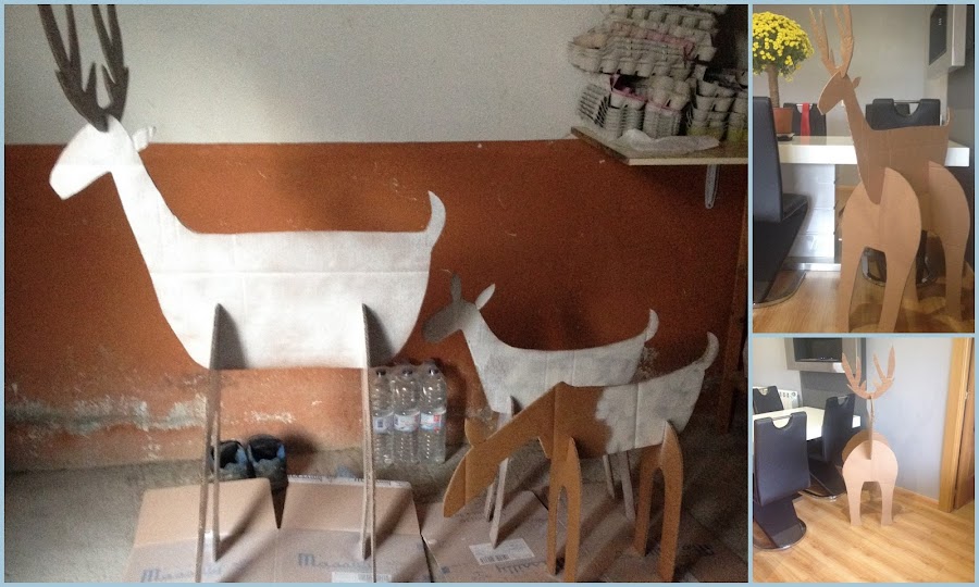 Lo primero que hemos realizado han sido los ciervos, los materiales usados; cartón, lapíz, cutter, brocha, cinta carrocero y pintura (blanco roto, gris claro).