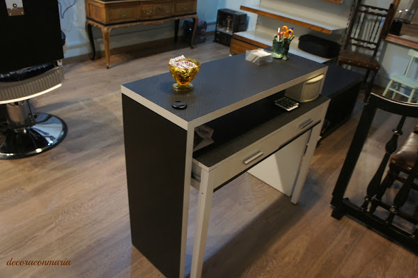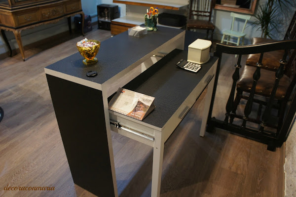 Hoy toca un cambio de estos frugales y que espero os pueda ayudar a tunear alguna pieza de esas que con unos sencillos pasos resolvemos....Se trata de un vinilo adhesivo que nos ayudará a reconvertir este escritorio de zona estudio.