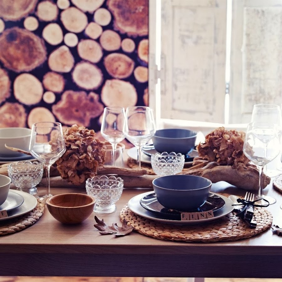 Creo que dará a nuestra mesa una forma diferente al vestirla, porque al aportar este toque natural la hará muy llamativa y poco convencional, pero a la vez la vistiera de una forma elegante con la vajilla y cristalería adecuadas, sino mirar estos dos ejemplos, para dos tipos de diferentes momentos, unos mas elegante, al introducir un mantel blanco y uno menos elegante pero igual de bonito para una comida entre amigos.