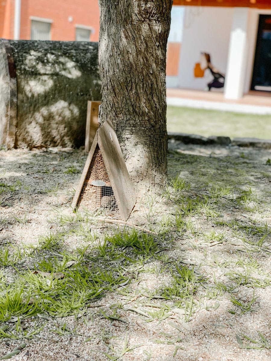 En cuanto a medidas nosotros pedimos que nos las hicieran de 1,50 x 1,50 y si no me equivoco 1,60 de altura para que cupiera en el sitio exacto que nosotros habíamos dejado. Por dentro poco a poco vamos decorando con guirnaldas de fieltro y hojas que tenemos por el jardín. También tenemos un pequeño hotel de insectos debajo del olivo, del que todavía no hemos recibido huéspedes pero que esperamos que este verano vengan los primeros. ( Lo compré en una venta de Westwing hace muchísimo)