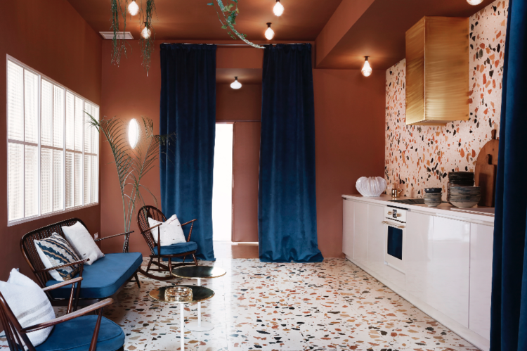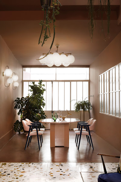 Terrazo, terciopelos, superficies rosas, toques irisados, plantas, luz...todos los ingredientes de un espacio de ensueño para los amantes del diseño, interiorismo y decoración, hoy por hoy.
