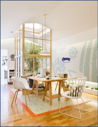 En todo el edificio predominará el blanco con toques de rojo y verde, que favorece la creatividad y representa la madera, potenciando el elemento fuego, relacionado con los negocios de venta.