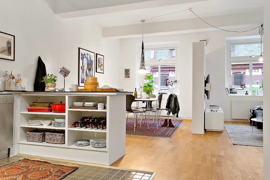 Los salones se abren para acoger la cocina y el comedor, así se crea los Living Room, la zona común donde mientras uno cocina y los niños juegan. Las separación se hace con muebles, alfombras o marcado con el cambio de suelo.