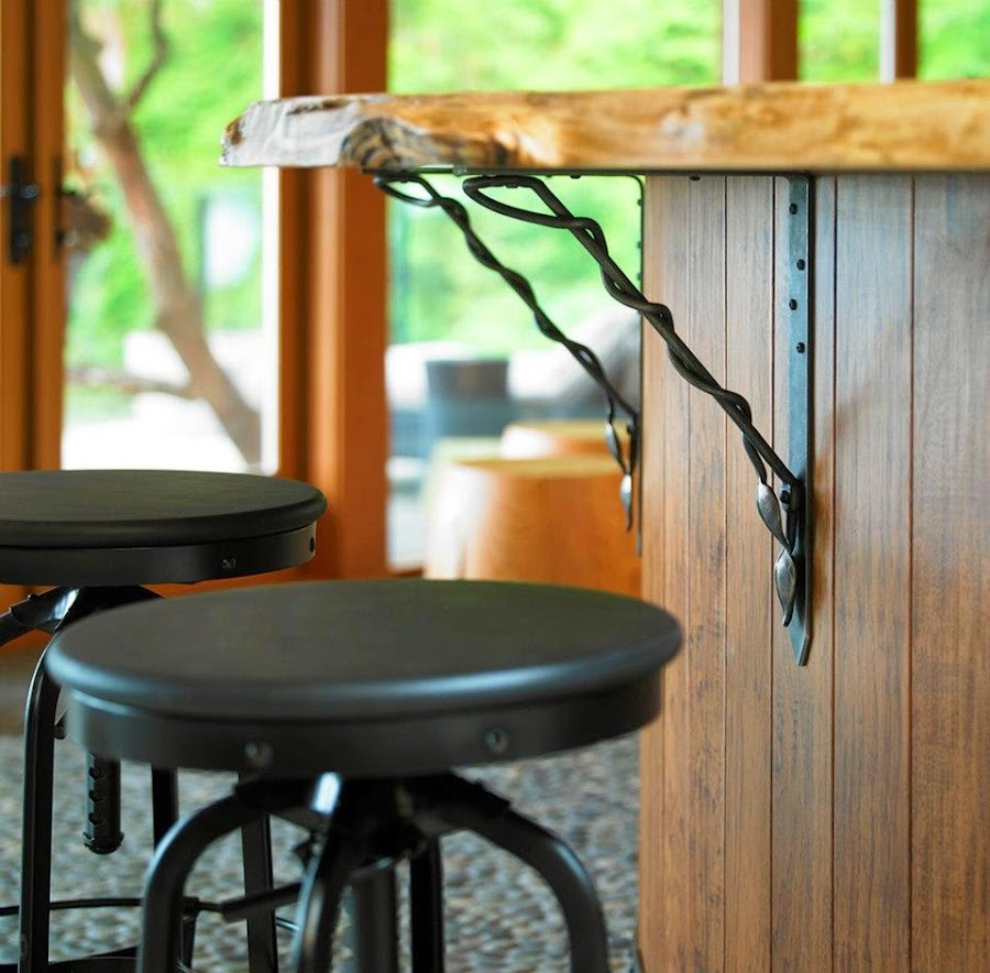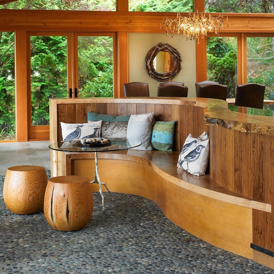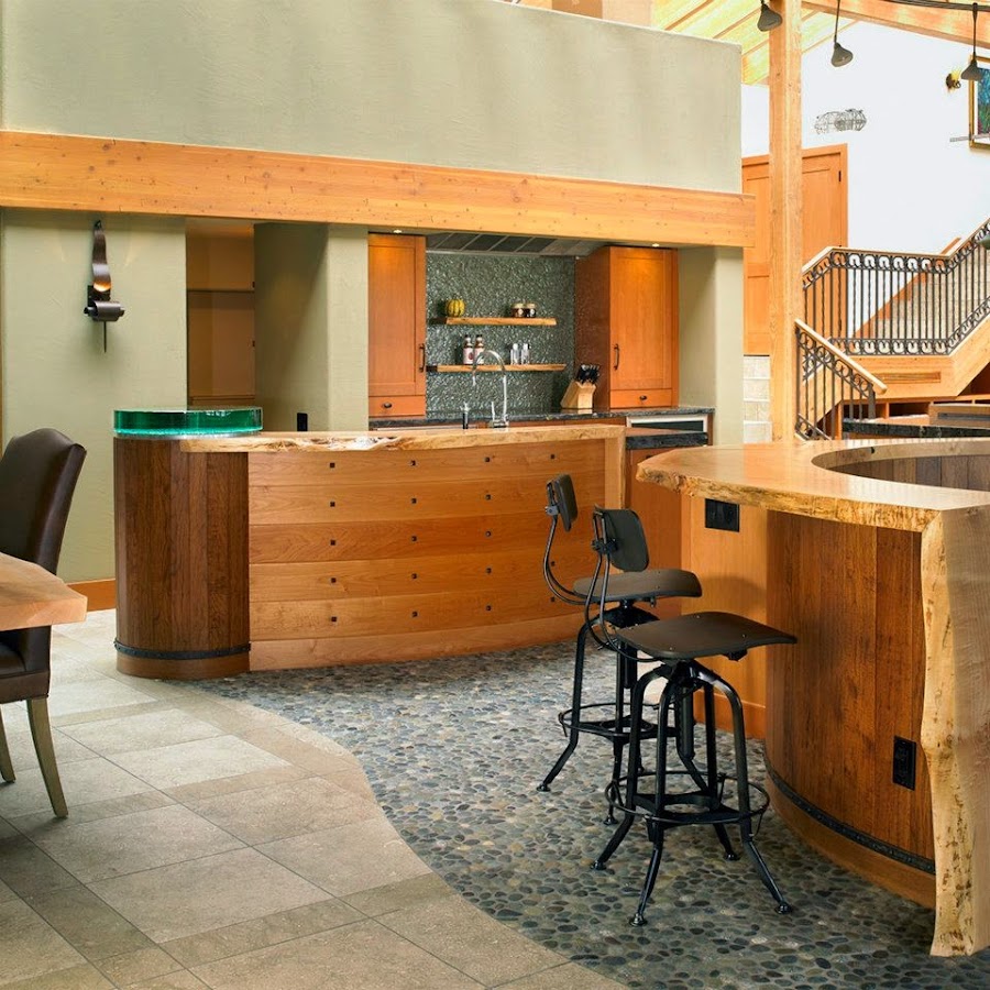 Un elemento clave del diseño es la sinuosa barra en forma de "S" de madera de arce y de terminación rústica de la isla principal de la composición, que incluye una agradable zona social, con mesa redonda de cristal. Detrás, se encuentra otra pequeña zona de lavado y el área de cocción al fondo, con la placa, hornos y frigorífico. La encimera de granito negro es otro de los materiales que destacan sobre la madera y en el suelo, varios tipos de piedras de río crean un patrón único y rompen el esquema de las baldosas de piedra caliza. Un magnífico y relajante estilo rústico.