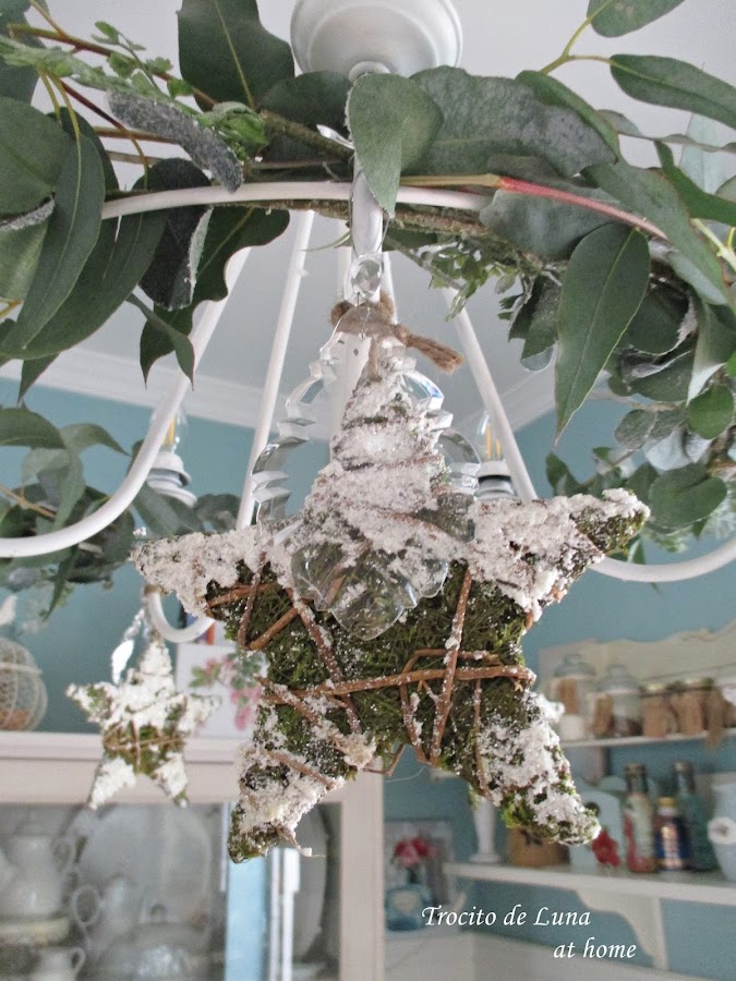 Debajo, para acompañar un poco a la gota de cristal que tiene la lámpara en cada brazo, unas estrellas con musgo y algo de nieve que me enamoraron nada más verlas!!