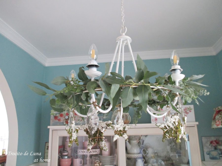 He de decir que la principal guía fue la lámpara que preside la mesa, la cambié, le quité el turquesa que la protagonizaba - ya me había cansado - y la engalané con greenery, color pantone tendencia de este año, verdor, hierbitas, algunas falsas y eucaliptus natural que le dio finalmente el toque revitalizante, refrescante y rústico-navideño por excelencia que yo ansiaba y que inundó la casa de aroma.