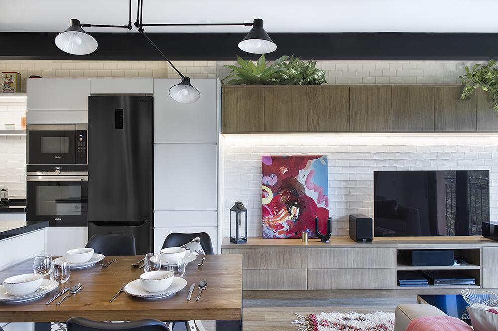 Junto a la isla, la mesa de comedor hecha a medida que da el relevo a la zona de entretenimiento enmarcada con un mueble en madera de roble natural sobre una pared de baldosas blancas estilo metro. Enfrentado al mueble de televisión, una amplia zona de trabajo/estudio coronada por una jardinera.