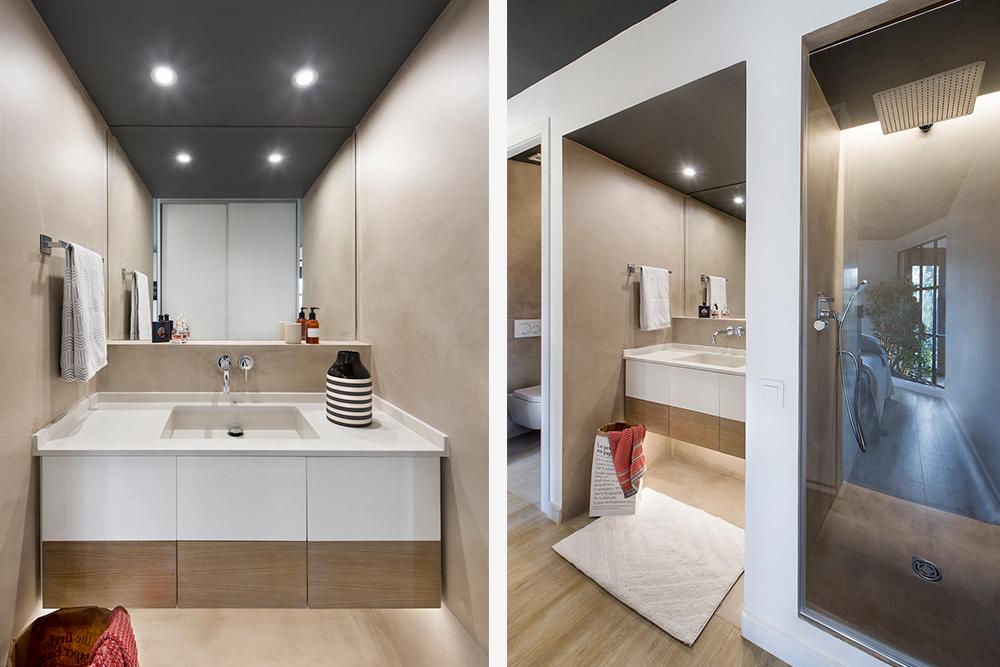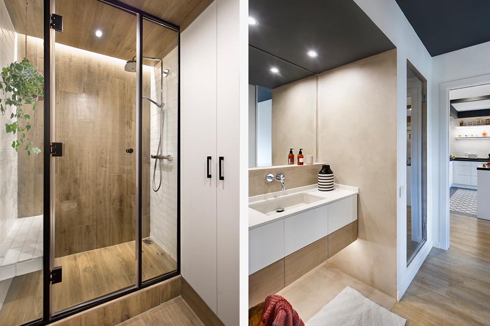 El espectacular baño se divide en tres compartimentos el espacio de aseo, ducha y un tercero con mayor privacidad donde se encuentra el inodoro. Las baldosas efecto madera también resaltan en esta zona del hogar, aportando un toque cálido y acogedor. La pared, que sirve de cabecero, separa la zona de baño del dormitorio. Una estantería sirve de forma inteligente como mesita de noche, aprovechando al máximo el espacio.