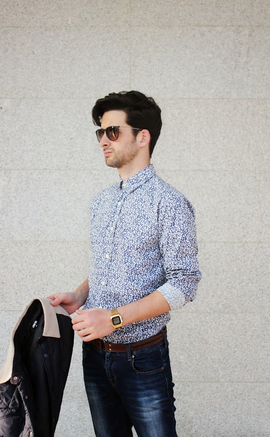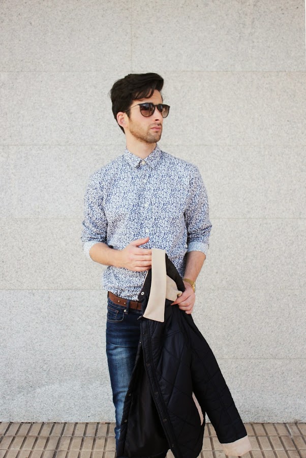 Dani: Mi look destaca por la camisa estampada claro, es por la que empiezas a crear tu outfit, no soy tan atrevido, todavía, como para mezclar estampados, pero si texturas por eso la he combinado con este abrigo guateado y con unos vaqueros engamando los tonos azules de la camisa.