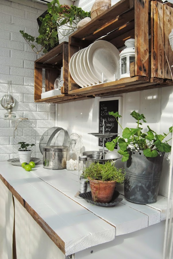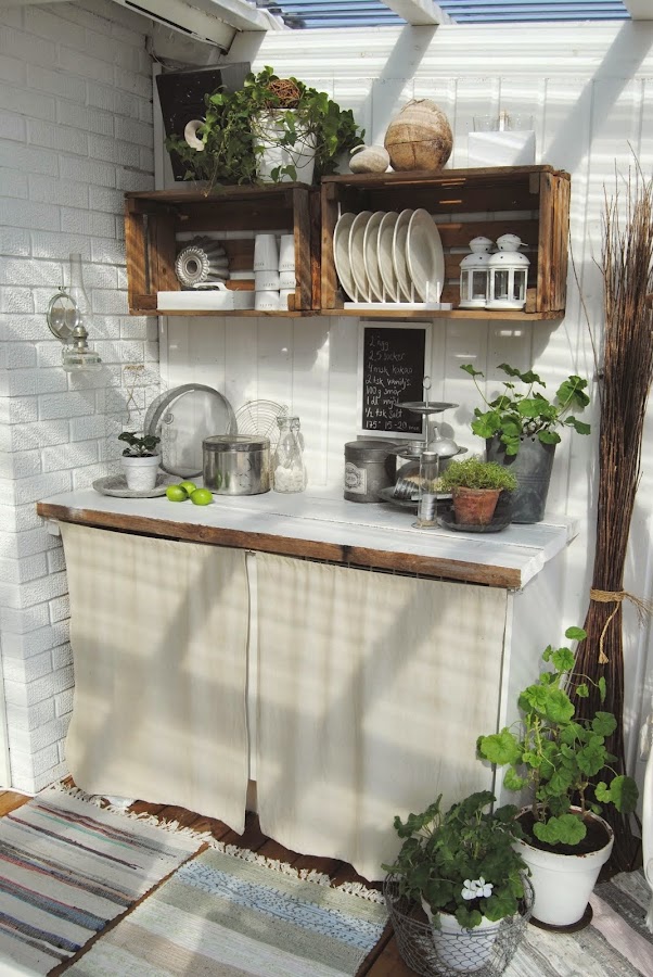 Parece mentira como con buen gusto, unas simples cajas se pueden convertir en algo tan útil ,como un estante para una cocina en un porche, e incluso en una terraza que tengáis en casa. Si sois de juntaros para hacer fiestas con los amigos, tendréis todo lo imprescindible, para no tener que estar yendo continuamente a la cocina.
