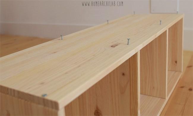 Por último, giras la pieza apoyando en el suelo el primer lateral largo ya atornillado, colocas el otro lateral sobre las baldas intermedias y pones todos los tornillos que faltan.