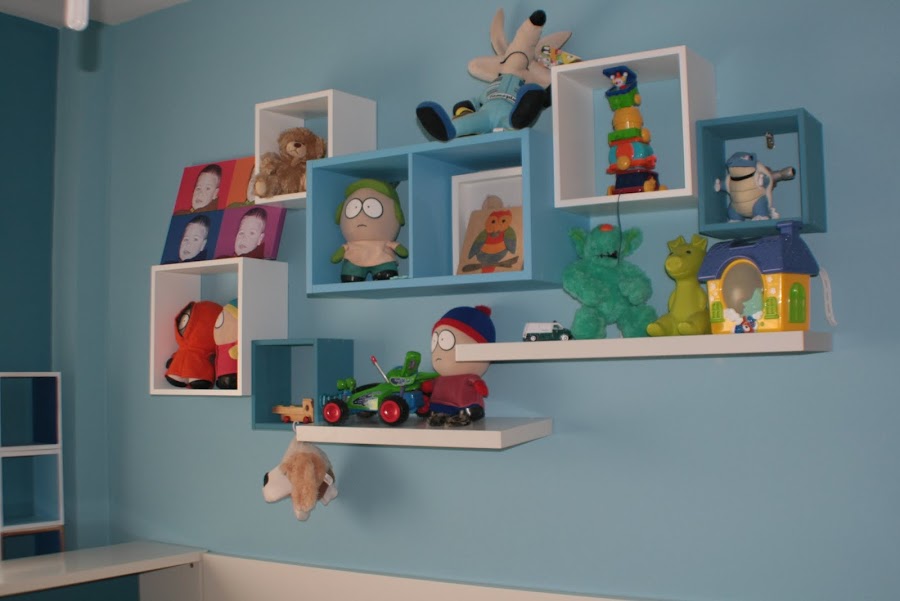Hemos querido combinar elementos lineales, para lo que hemos empleado estantes LACK de Ikea, con elementos volumétricos, como son los cubos de distintos tamaños y colores. Los 3 cubos blancos, cada uno de un tamaño, los compramos en Leroy Merlín, así como el celeste de 2 módulos, que venía muy bien con el color en que habíamos pintado el dormitorio. Los otros cubos más pequeños, son parte de una estantería IVAR para CD"s de Ikea, que originalmente eran de madera de pino y los pintamos para adaptarlos a la composición.