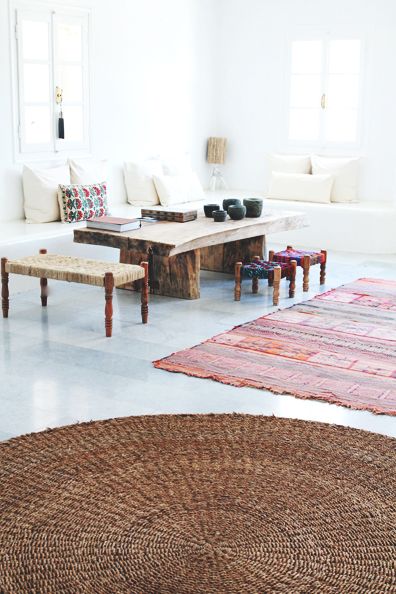 Nuevamente alfombra y nuevamente colores neutros. ¡Me va a encantar cambiar el look de mi casa este verano con estos simples complementos! El toque de verde, muy importante para una buena composición Boho.