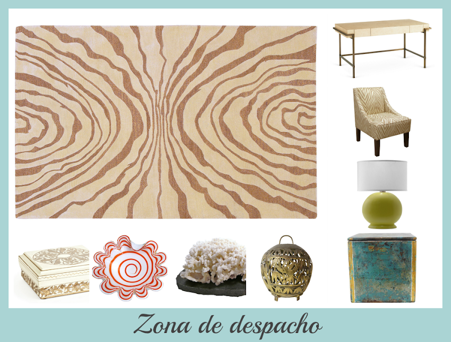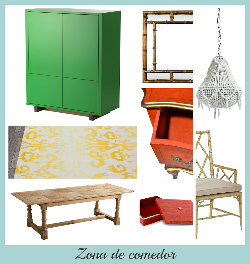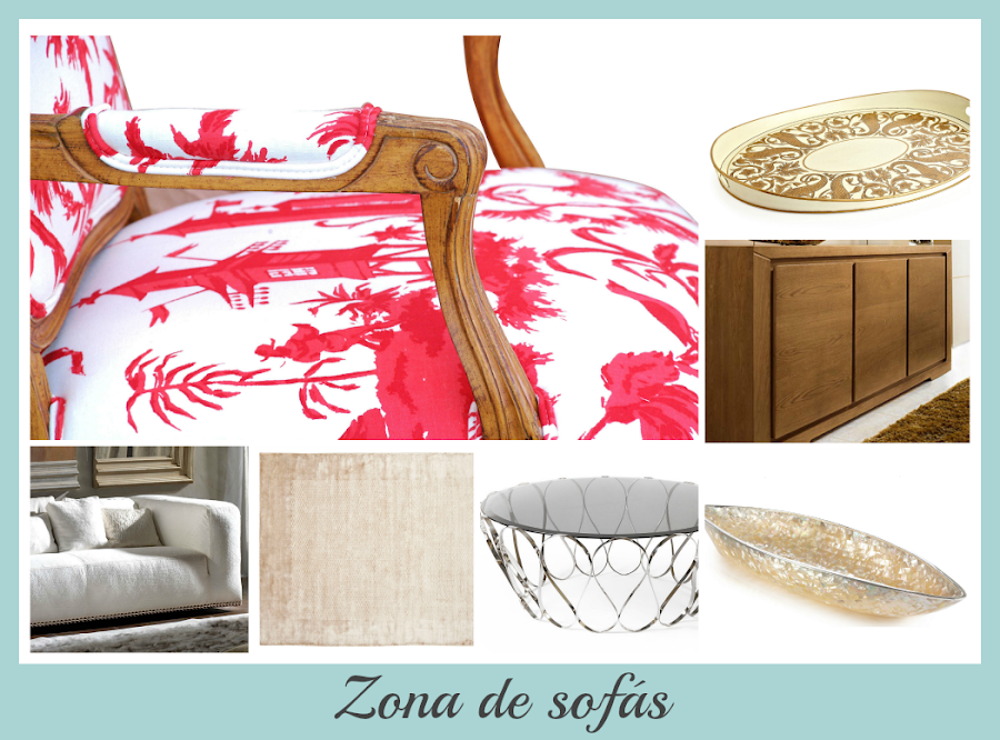 He planteado que estuviera localizado en un salón con comedor y despacho. Cada zona delimitada por una alfombra, pero con una continuidad en el estilo decorativo, ya que sería el mismo espacio abierto. Lo ideé en estilo ecléctico chic, pues ya puestos a imaginar me lo iba a poner más difícil todavía. Ya que me parece que, por lo que veo por ahí, no está muy visto a este lado del océano. Y me ha costado bastante que me "entrara", al principio me parecía algo caótico, recargado y un tanto hortera, pero como todos evolucionamos, ahora mismo me encanta. Para mi la dificultad estriba en encontrar el equilibrio entre todos los diferentes elementos y estilos aquí presentes.
