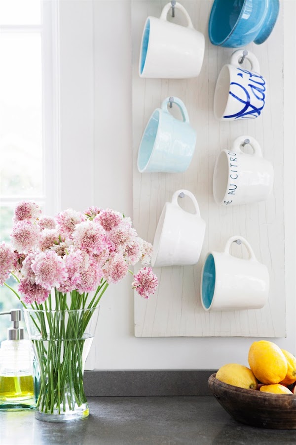 En la sala de estar se jugado con los rosas, blanco y negro dando el color en los textiles, por cierto, adoro esa mesa hecha con una vieja puerta y un par de ruedas y pintada en color mint!!