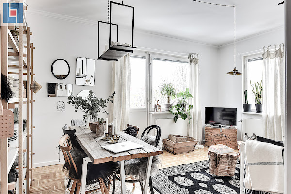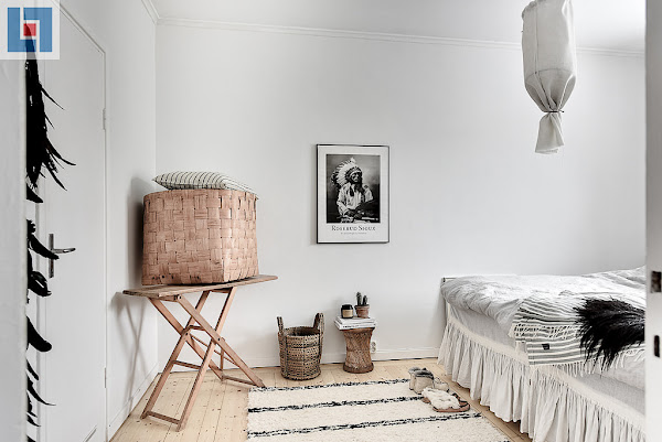 Lo que mas me gusta del estilo étnico y por tanto también de este piso es precisamente ese toque natural que se consigue principalmente mediante los textiles. Estos suelen estar hechos a mano y con motivos indígenas que varían según las distintas culturas, como pueden ser los indios navajos, esquimales o tribus africanas. Aunque los textiles no van solos en esta decoración para crear esa sensación natural. También podemos ver el uso de la madera casi en bruto para el mobiliario (como pueden ser los troncos usados como mesitas) y el mimbre para objetos decorativos, ya sean cestos u otros objetos.