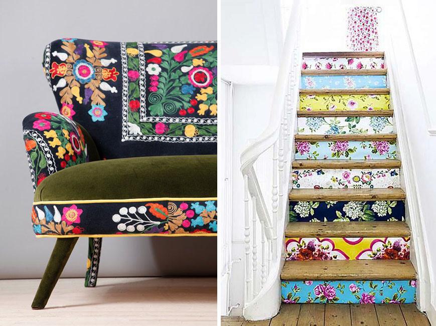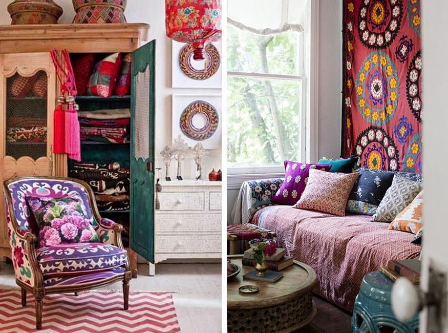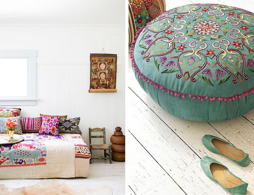 1.- El estilo Folk apuesta por tejidos con mucha riqueza y en colores vibrantes. Decorad con otomanas bordadas artesanalmente, sillas y sofás tapizados en terciopelo, colchas de ganchillo y patchwork, cortinas de seda y brocados, o almohadones y cojines que mezclan entre sí todo tipo de estampados y texturas, principalmente con motivos florales, geométricos y tribales.