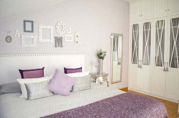 En el dormitorio encontramos una idea estupenda para el cabezal de la cama, una composición de marcos-letras, una idea sencilla, atemporal que no te limita al cambiar textiles ni complementos y además decora que da gusto