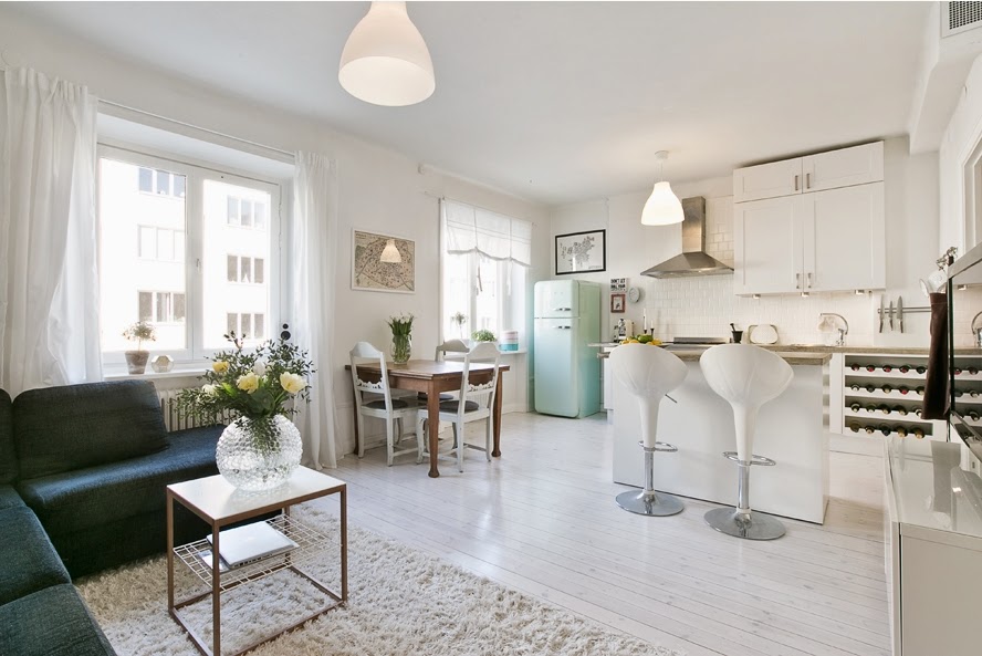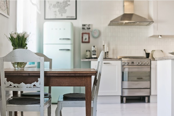 Si algo me ha encantado de este piso es el dormirtorio, la lámpara Fly de Kartell junto con la silla reciclada me ha parecido un contraste perfecto, por supuesto sobra decir que la nevera SMEG en tono mint me ha robado totalmente le corazón, pero claro eso ya son caprichos de otro nivel.
