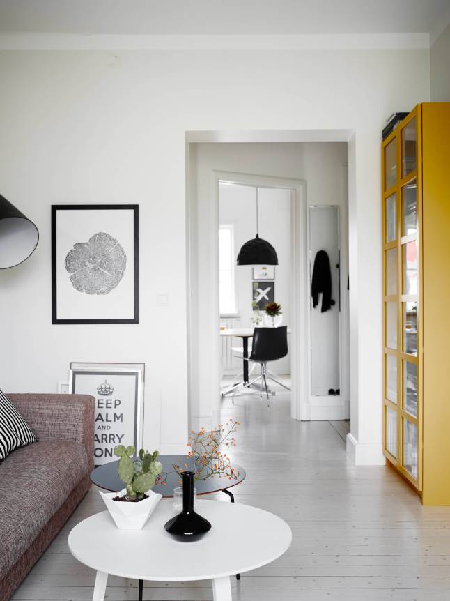 La elección del color amarillo para romper con los tonos neutros, blanco y negro, del salón resulta perfecta, no os encanta esa vitrina amarilla?