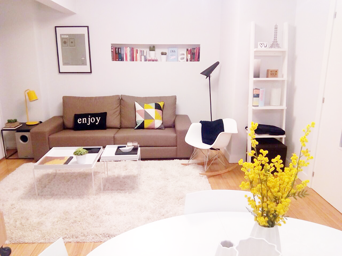 Eso si, para dar un poco de calidez entre tanto tono blanco y beige, decidí añadir pinceladas del color amarillo para hacer la estancia un poco más acogedora.