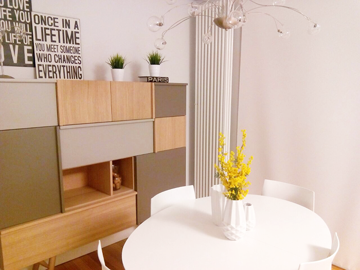 Cuando vi las fotos del comedor de Soiartze, tenía muy claro que debíamos poner una mesa redonda para ahorrar espacio y romper un poco entre tanta línea recta . A mi clienta le pareció una idea fantástica, lo único que me pidió fue que pudiera extenderse y bueno, eso tampoco ha sido difícil. Encontré un modelo perfecto, blanca, redonda y extensible, con las patas del mismo color que el mueble del comedor. Genial !!. Además, la pudo comprar a muy buen precio en una de las tiendas online de venta flash.