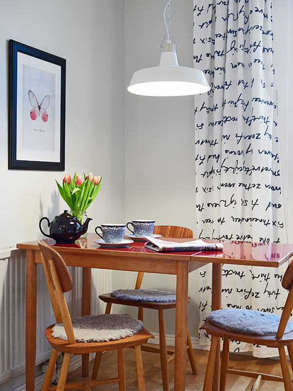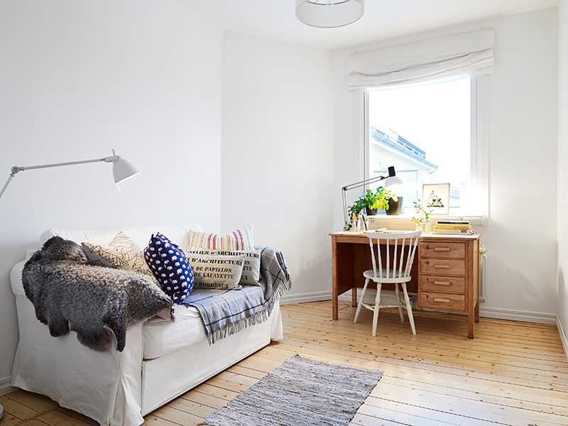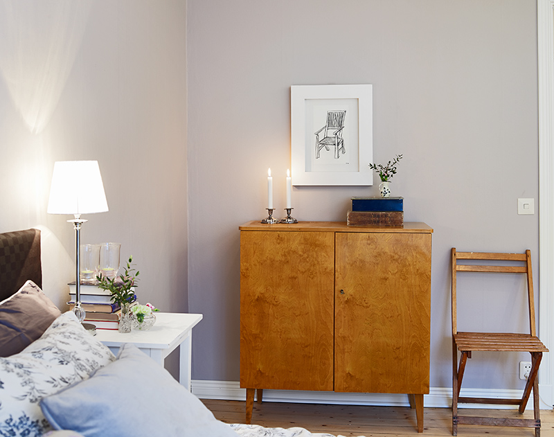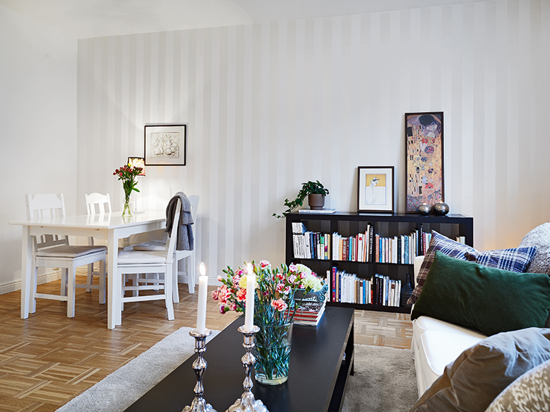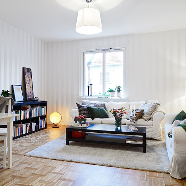 Me ha traído recuerdos de mi piso y como un papel tan sencillo puede soportar el paso sin quedar desfasado, los colores metalizados consiguen quitar seriedad a una línea clásica convirtiéndolo en un papel actual. El resto de mobiliario con un gran porcentaje de Ikea mezcla tanto estilos como colores, integrando todas las piezas como si fuera un puzzle.