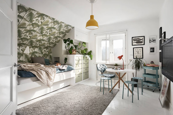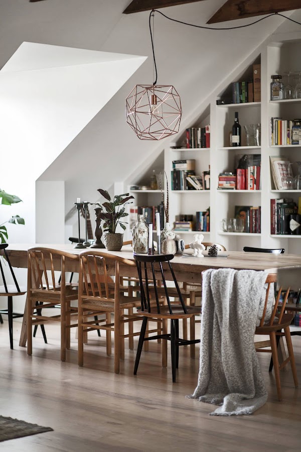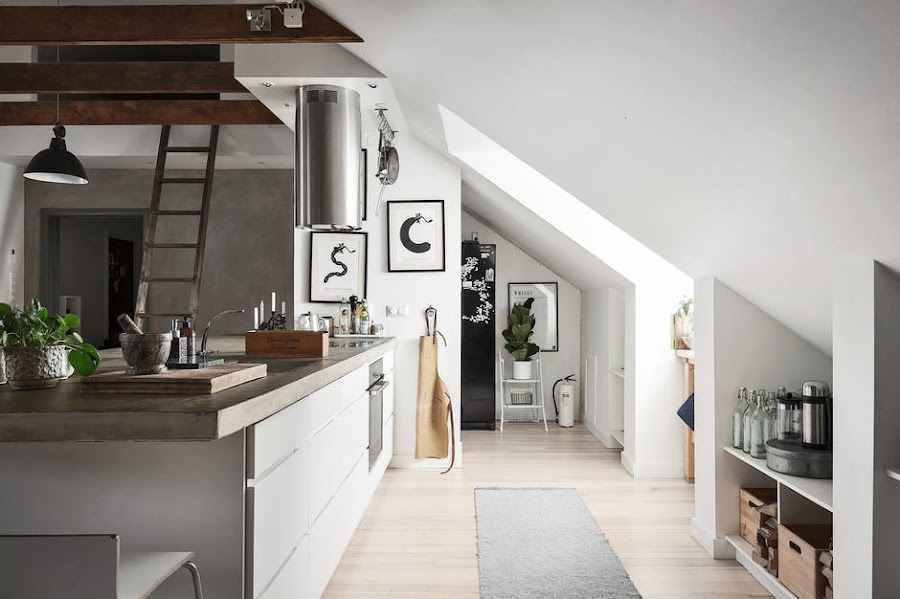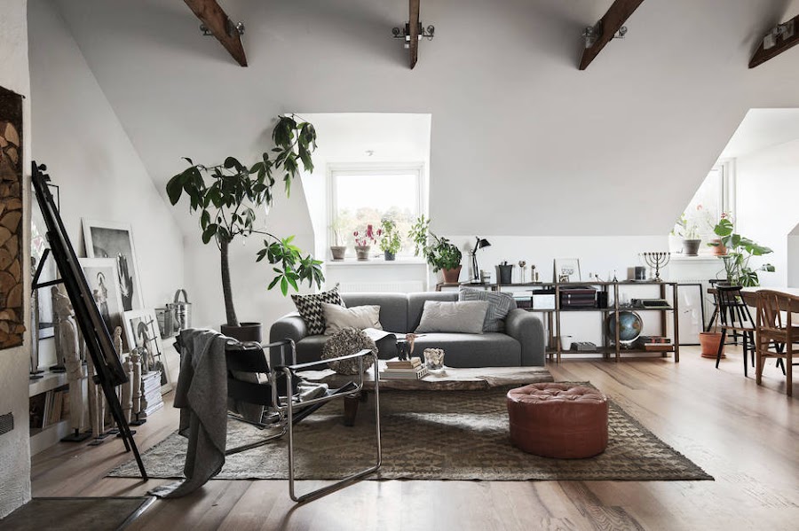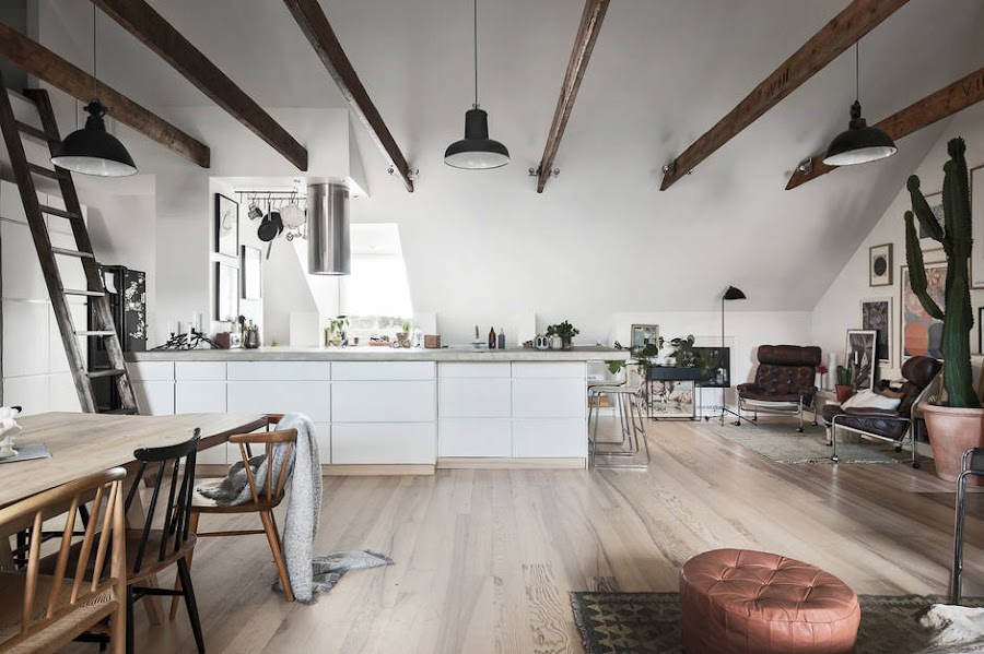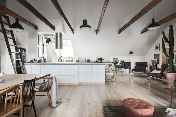 Nunca tengo suficiente cuando se trata de visitar estos bonitos áticos, el estilo nórdico me parece siempre especialmente atractivo en estas situaciones.Si ya de por si este estilo nos ofrece mucho, sumándole las vigas de madera ya adquiere mucha mas personalidad el conjunto. Creo que hemos visto conjuntos de vigas mucho más bonitas que estas pero sean como sean, la madera de estas nunca dejara de otorgar a los espacios mucha calidez.
