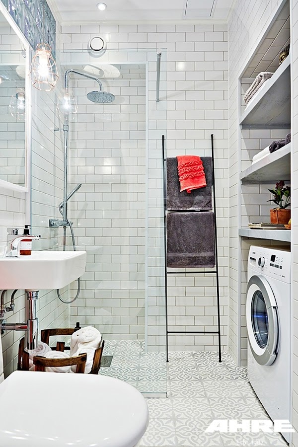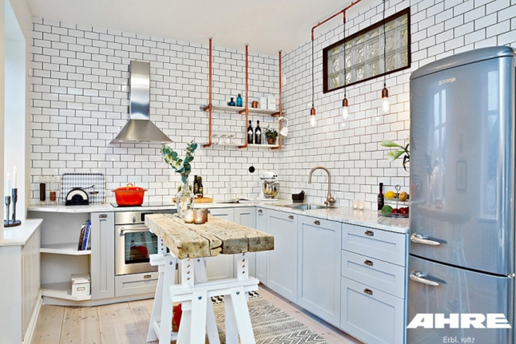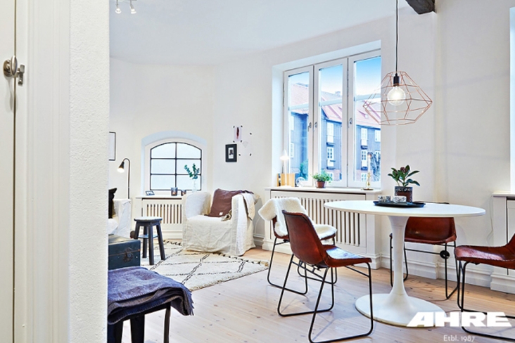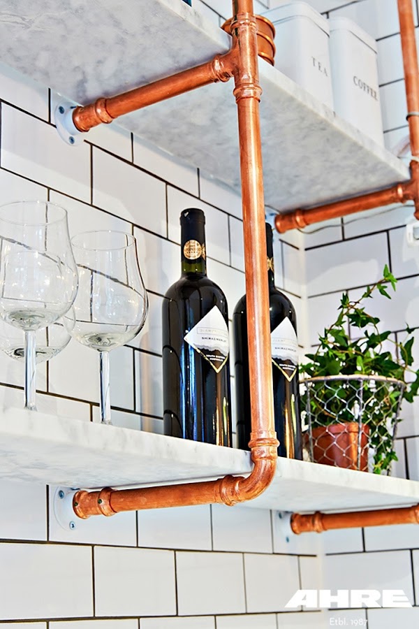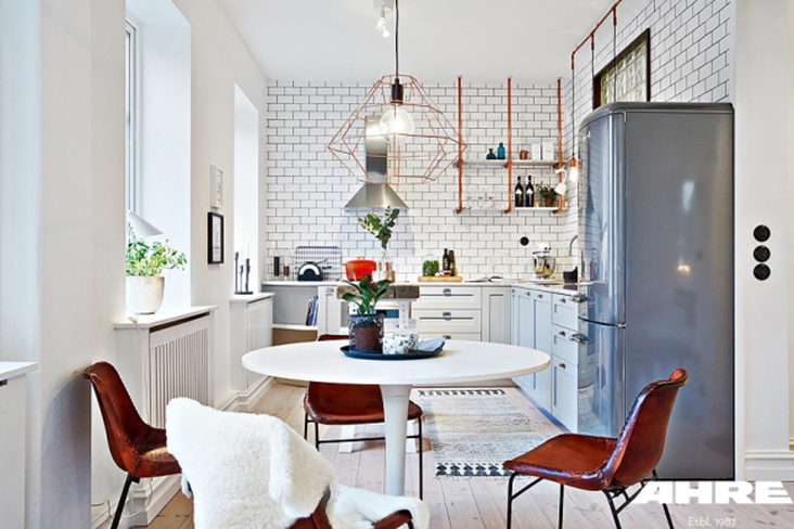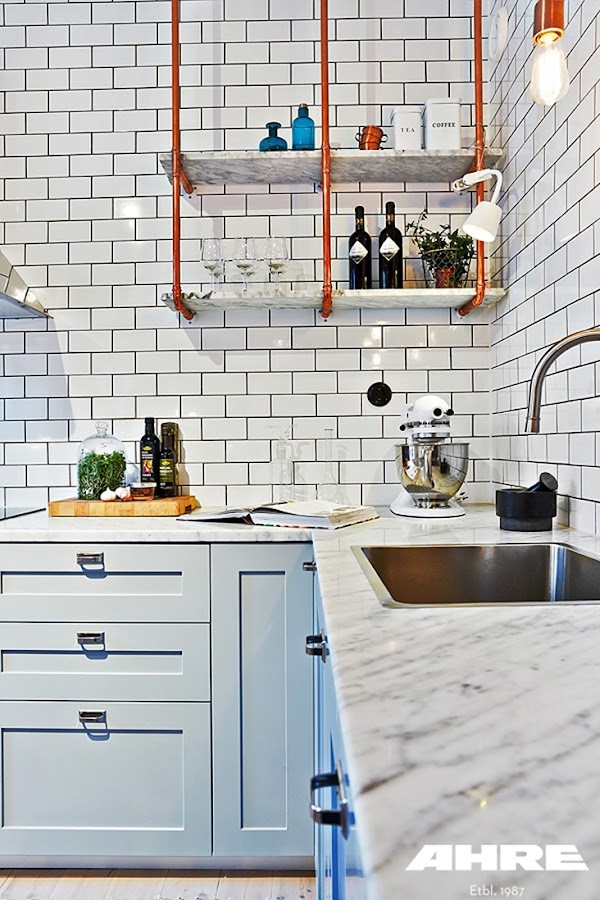 Cuando vi este apartamento me llamó la atención la armonía de varios elementos industriales como las tuberías en cobre que sujetan los estantes y las luces de la cocina, el cabecero de la cama hecho con un palet, o la escalera del dormitorio. Por otro lado tiene personalidad, prueba de ello son las sillas forradas en cuero o el baúl antiguo adaptado como mesita de café. Eso sí, sin abusar de lo masculino, yo en mi cabeza imagino que aquí vive un chico ya que las mujeres tenemos más tendencia a decorar con detalles femeninos.