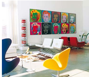 Los adornos son también algo que le da mucha vida a cualquier ambiente. Puede incluir lámparas, jarrones con formas rectas y geométricas o colores fuertes . Busca piezas que te recuerden a la estética de los 70. Sillones oreJeros, sofas chesterfield, sofás a base de asientos modulares...... muebles de lineas rectas y depuradas. Salpica por las paredes algunos lienzos basados en el estilo Andy Warhol (serigrafías de Marilyn Monroe) o lienzos con dibujos de comic con fuertes colores. Utiliza mezclas de colores como el naranja, el amarillo, el verde pistacho, el rojo con morado, marrones, azules y verdes intensos..... Este estilo también se puede utilizar de modo más suave, mezclando menos colores y suavizándolo con el color blanco, obteniendo un deco pop más armonioso. Esta forma de decorar se adapta muy bien al estilo de vida joven, independiente, moderno y preocupado por la estética. ¡¡¡¡ DESAFIANTE, TRANSGRESOR, Y DESENFADADO !!!! POR LO QUE PUEDE SER TODO LO INNOVADOR QUE QUIERAS .....