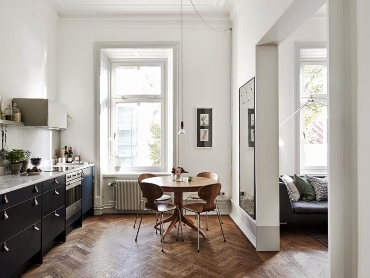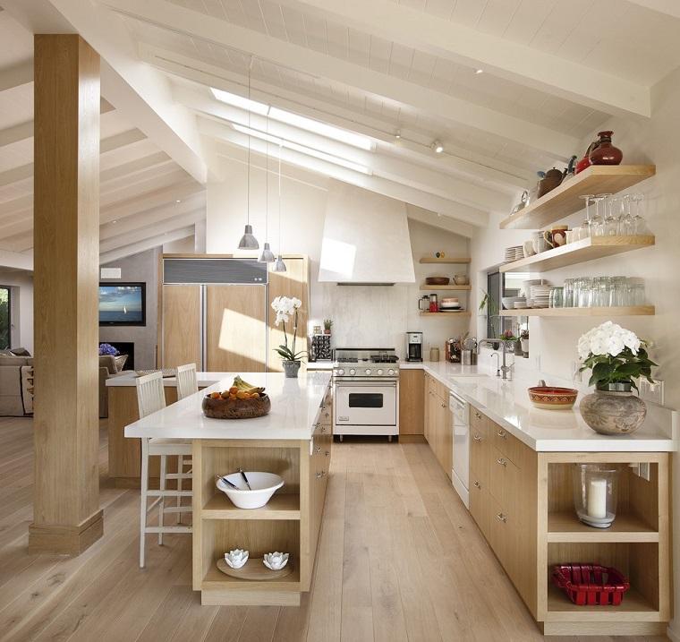 Blanco y madera. Elige los revestimientos de tu cocina en blanco y el resto en maderas claras o de tonos medios. Lograrás un ambiente luminoso pero más cálido y tendrás lo mejor de cada uno.