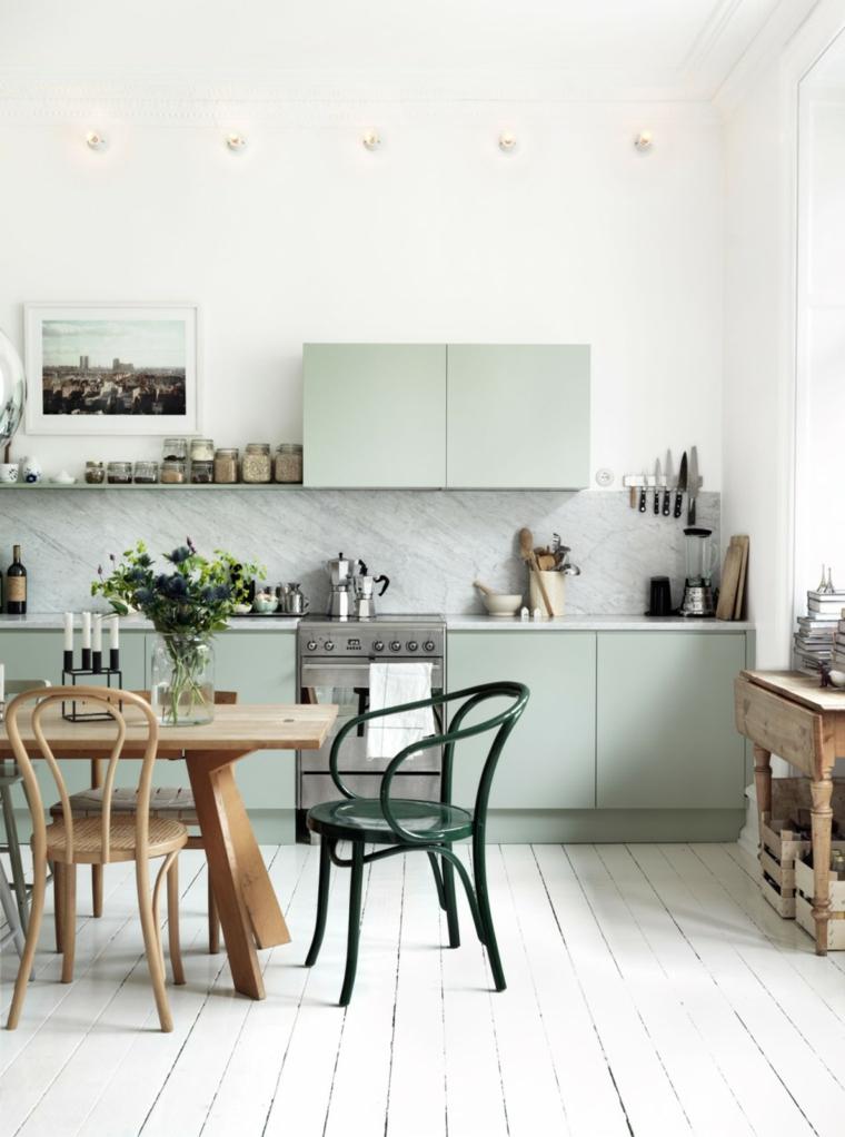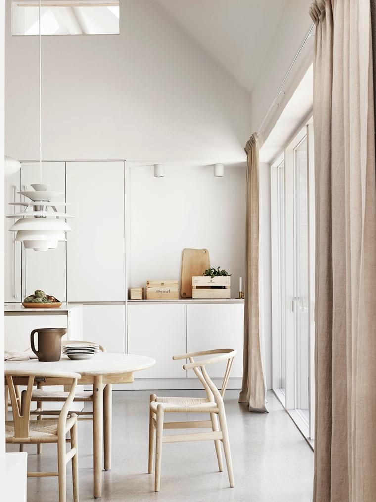 Como clave para conseguir una cocina nórdica es no abusar de elementos de mobiliario para crear un diseño básico pero muy atractivo. El blanco es el color más usado en la mayoría de estas cocinas, buscando la sensación de espacio libre, incluso si se diseña en un área pequeña. En lugar de utilizar estantes y muebles cerrados, opta por estantes abiertos que se pueden utilizar para que la cocina parezca espaciosa. Un grupo de muebles en una pared lateral en lugar de en la pared principal, ahorra espacio y es el mejor concepto que puede usar si se quiere una cocina ‘scandi’.